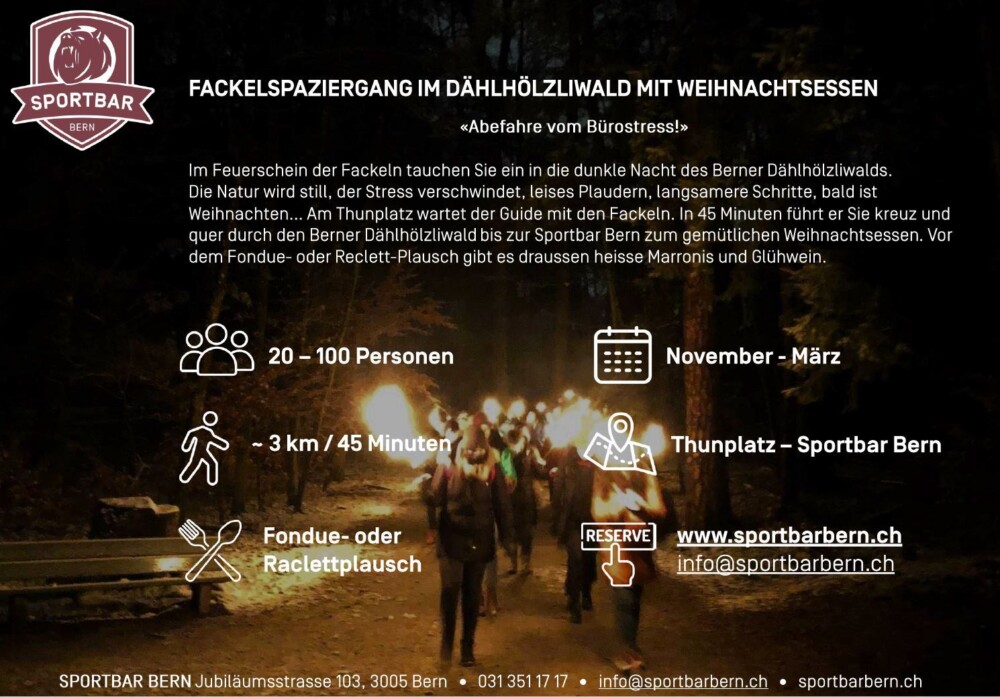 In den Wintermonaten (Oktober - Februar) können Firmen- oder Privatanlass mit Eisstockschiessen, einem Karaoke-Event, einem Krimi-Dinner oder einem Fackelspaziergang durch den Dählhölzliwald kombiniert werden. Buchungen für diese Zusatzangebote nehmen wir jederzeit gerne entgegen.